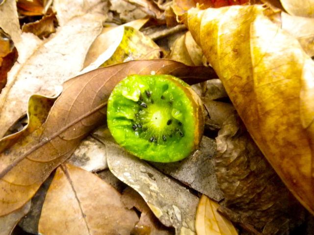 秋も深まり、だんだん肌寒くなってきました。この時期、島の西側に位置する西部林道を散策していると、見た目がキウイフルーツそっくりな実が時々落ちていています。
